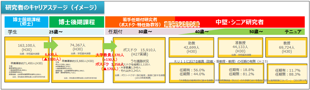 つまり、大学院で博士号を取得し、その後ポスドクや特任助教といった若手研究者として研究を行い、その後准教授や教授としてキャリアを進めていくことが想定されています。