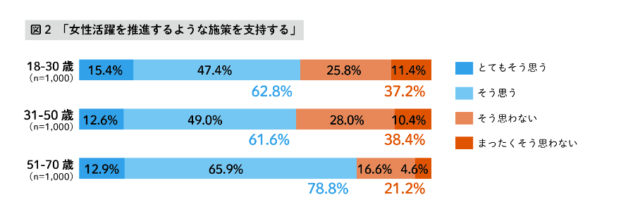 女性活躍を推進するような施策の支持をしない男性の割合は、50代以下の男性と50歳以上の男性では明確なギャップが存在します。もちろん、50代以下の男性のほうが賛同できていない割合が多いです。